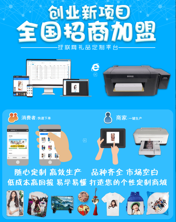 我们提供一整套技术服务,包教包会,投入小,回报大。现在手机壳定制已是一种常态,需要量大,一家天猫网店,月定制量上万件,可见市场需求巨大。在线下,现场定制.客户自己设计,3分钟马上拿到自己心爱的定制手机壳,还没有。市场空白,我们互联网+定制,有一台非常小巧,轻便的数码印刷机,通过我们的定制生产系统,高效方便快捷,平均3-5分钟完成一件,每件利润在10-15元。平均每天做30件,月入过万不是梦。而且不需要开店,不需要有专业技术。随时随地开展生产。适合景区、学校、步行街、商场、夜市、网店和微信朋友圈。